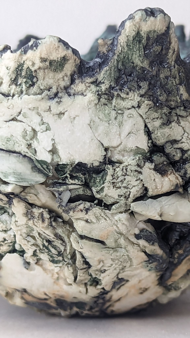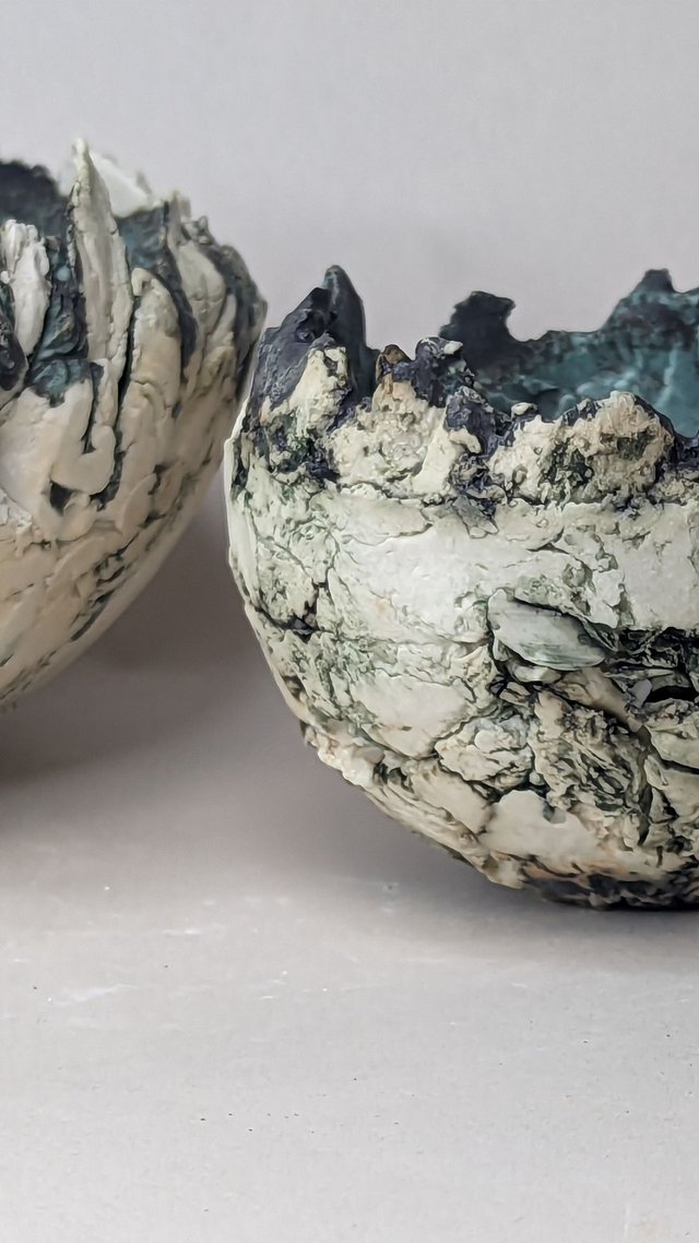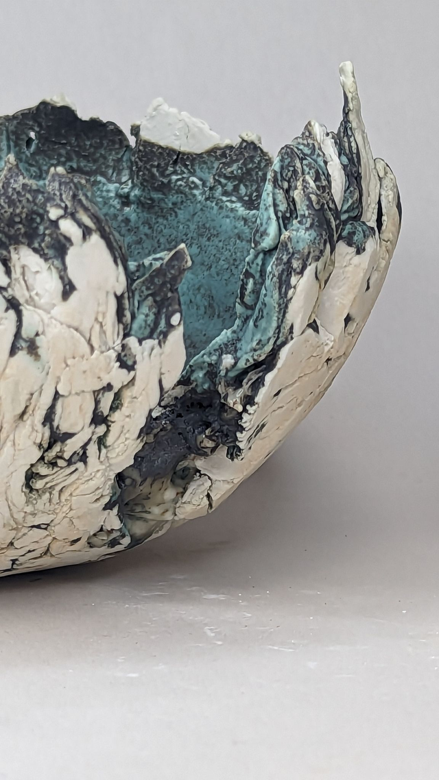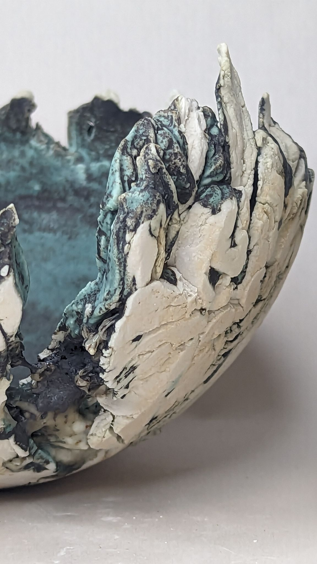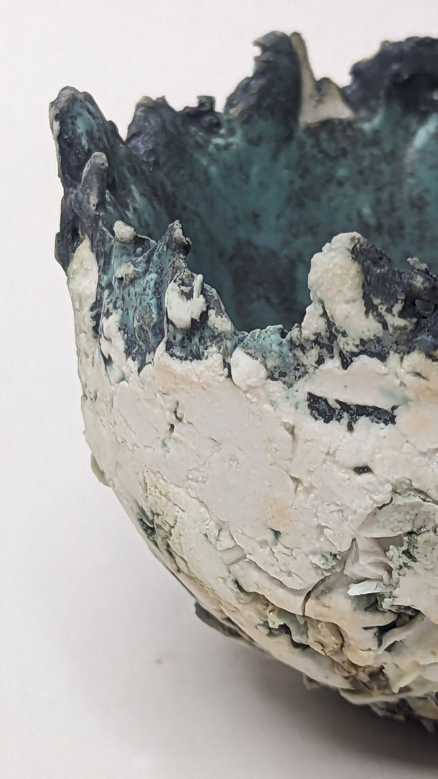 "Glacier" is a breathtaking fusion of clay and porcelain, capturing the raw power and fragile beauty of ice formations. This sculptural bowl evokes the shifting landscapes of our changing world. Layers of crackled porcelain mimic the fractured surfaces of glaciers, while deep, oceanic blues and oxidized textures flow like melting ice into water.